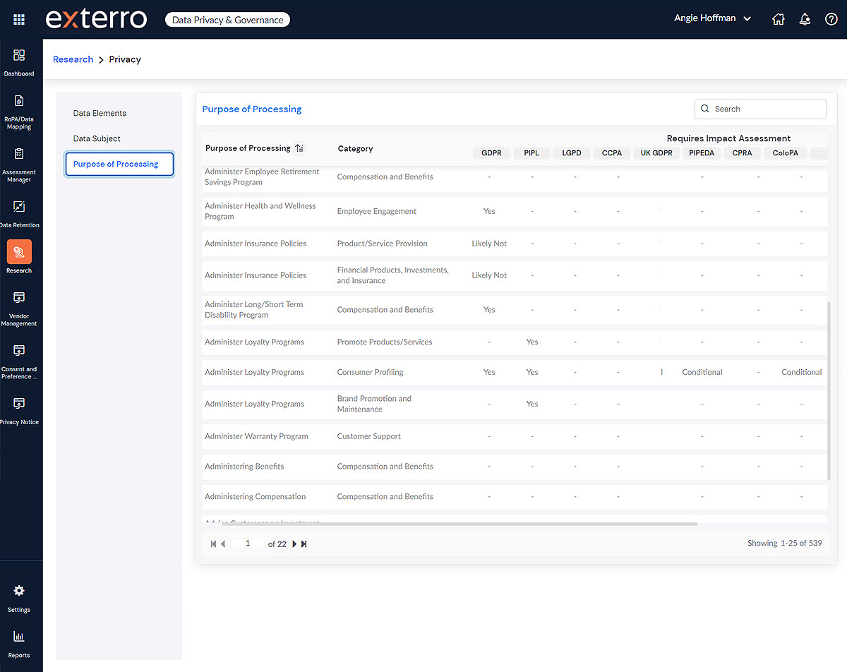 Exterro Assessment Manager includes an extensive library of privacy research, providing a detailed guide to processing activities that may require impact assessments under various privacy regulations worldwide.