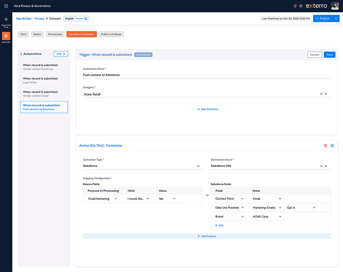 Exterro Consent and Preference Management is a flexible, API-driven solution that simplifies the collection and management of customer consent and preferences from multiple touchpoints. With customizable, no-code forms and the ability to quickly connect to all major applications—or easily build custom connectors—our platform provides a centralized dashboard to manage consent and preferences across all channels.
