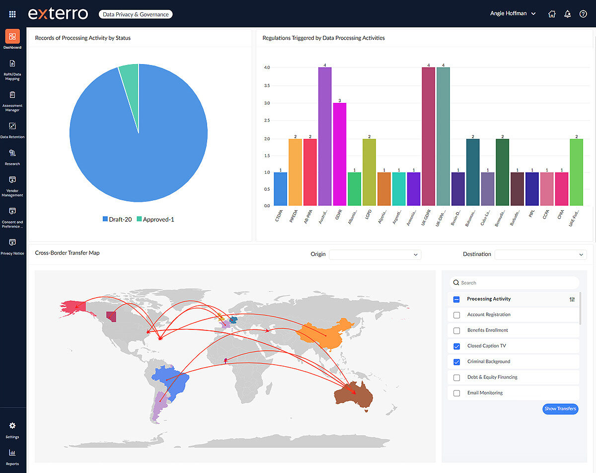 RoPA Manager provides a centralized, configurable dashboard that displays a cross-border transfer map, regulations triggered by data processing activities, and the status of those activities. This allows users to get a deep understanding of their record of processing activities and cross-border transfers quickly and efficiently.