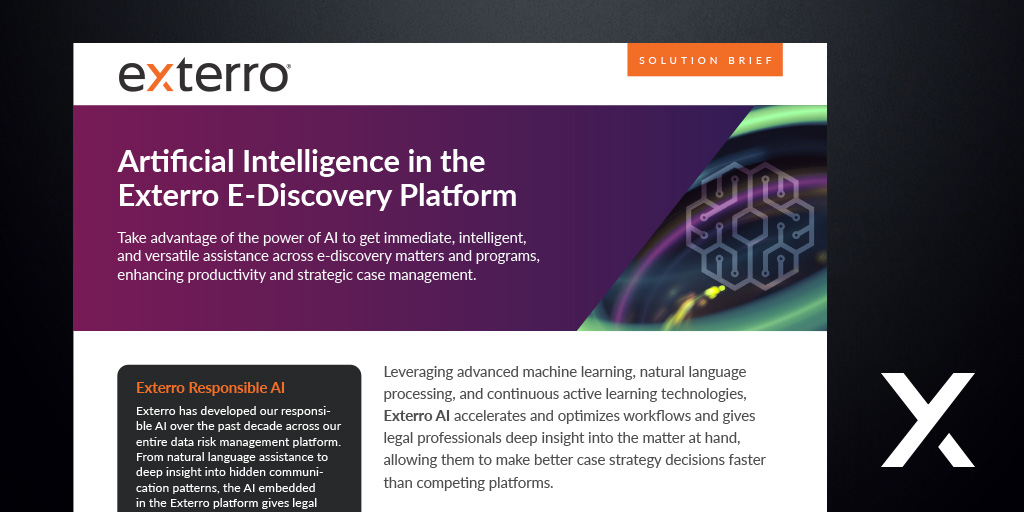 Exterro has developed its responsible AI capabilities over the past decade across its entire data risk management platform. From natural language assistance to deep insights into hidden communication patterns, the AI embedded within the Exterro platform empowers legal professionals to manage e-discovery projects more easily, efficiently, and defensibly.