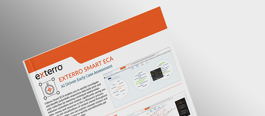 Download this product brief to learn how Exterro Smart ECA enables you to quickly identify potentially responsive data both prior to and post collection by exposing contextual relationships between custodians and content, significantly saving you time, money and resources in the e-discovery process. Through rich visualizations of content stored throughout your organization, Exterro ECA, Collection, and Processing enables you to explore concept clusters and communication patterns to quickly and defensibly get you to the facts of every matter.